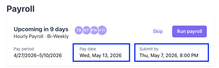 Your workers will get paid on the pay date you selected, as long as you submit payroll by the cut-off time.