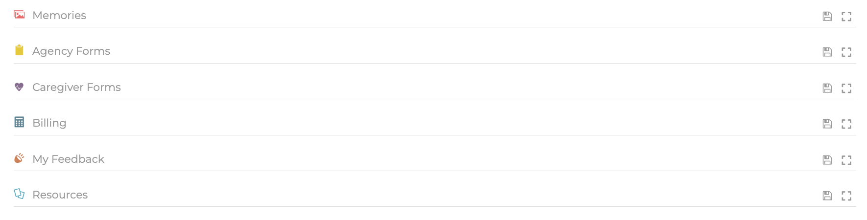 Beneath these options, there may be several other categories of information, again, depending on how the Client or Representative has been set up by the agency. Click on the section heading (such as Caregiver Forms or Billing) to see a list of information for that area.