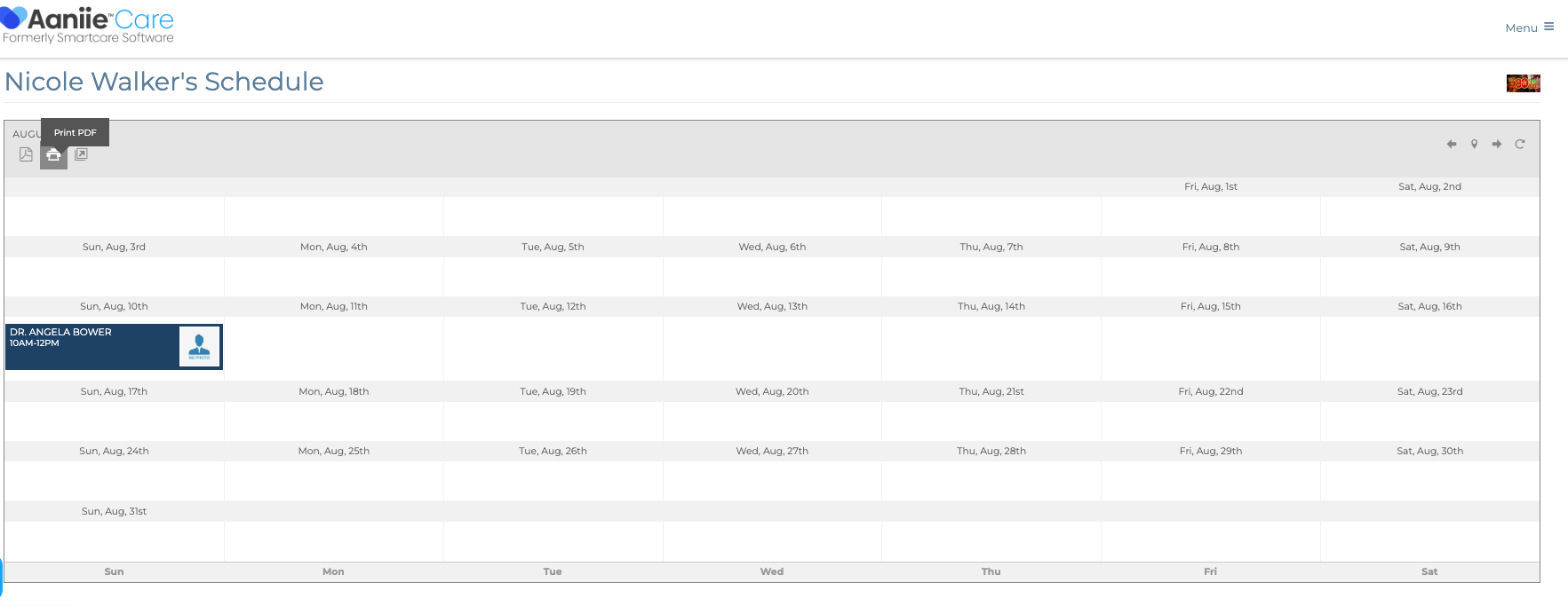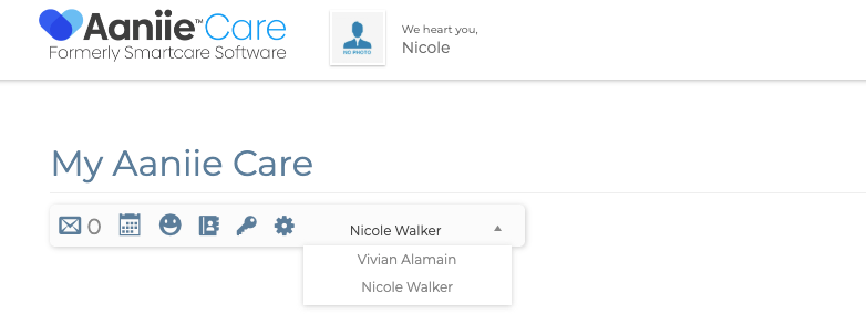 The icons directly under “My AaniieCare” allow access to, left to right: –Messages for the Client or Representative, and the # of unread messages. –The “My Schedule” page for the Client –The Shift Signatures for the Client –Update the Contact Information for the Client or Representative –Update the Profile Picture –Change the Password –Edit Personal Settings