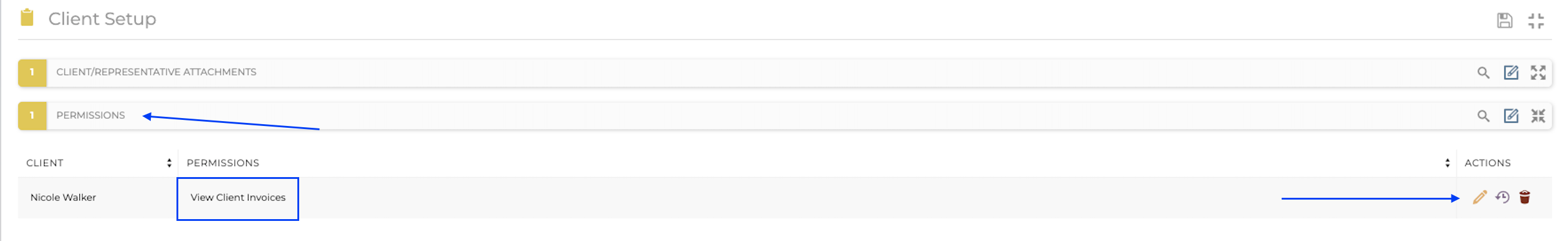 2. In the Client Representatives profile, select the Client Setup section. You can attach a client if not already done in the Client/Representative Attachments section. In the Permissions section choose the client, then what you would like the rep to have access to in their login.