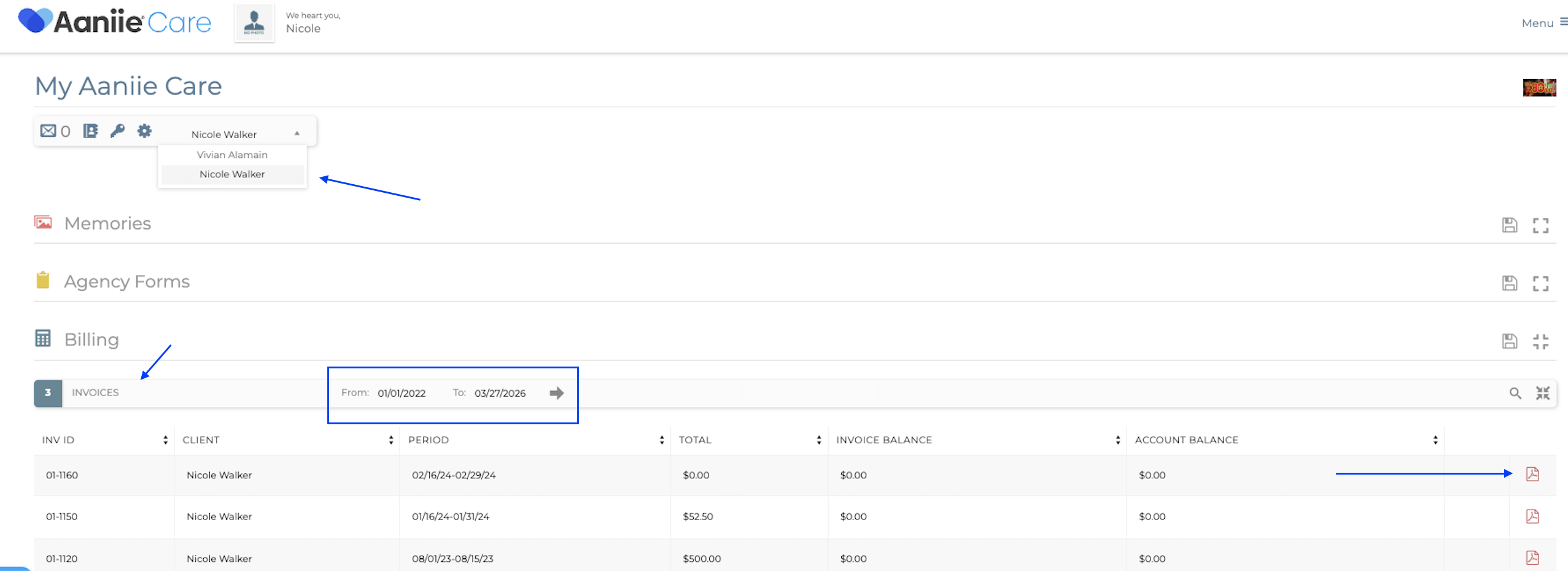 4. Once the Client Representative logs in to their portal they will select the client who invoices they would like to view. Enter a date range for the invoices, and click the right arrow. The invoices will populate below and you can click the Adobe icon to view or print the invoice.
