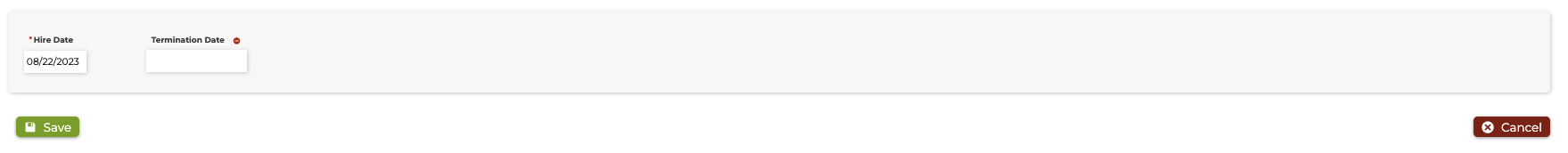 8. The Hire Date will carry over from when the staff member was registered in the system. Enter a Termination Date, click Save when complete.