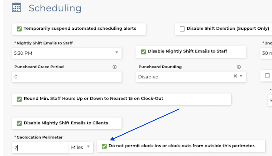 This would be helpful if you have a Client that staff may clock in for Office or Admin duties. If your GEO location perimeter is required to be within a certain distance this may cause issues for staff at clock in. You can now exempt those clients so the staff can clock in from any address without issues. This will keep the GEO location perimeter required for all other clients.