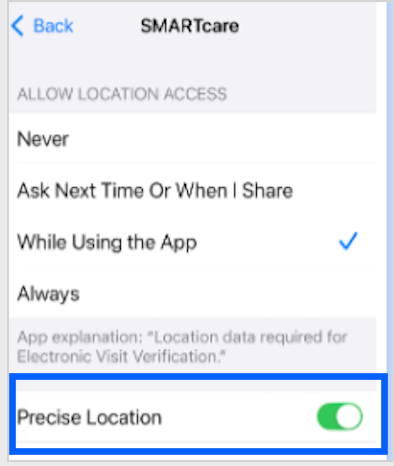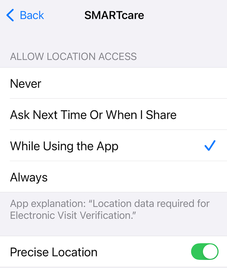 If Don’t Allow was selected and the location is turned off. Access the settings of the phone and search location. Find the Smartcare app and make sure that you select the following option pertaining to the location.