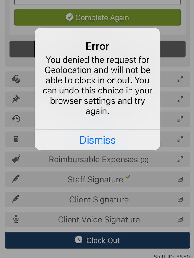 If the caregiver is receiving error messages when attempting to clock in or out via the mobile app on an IPhone device follow below steps for troubleshooting.