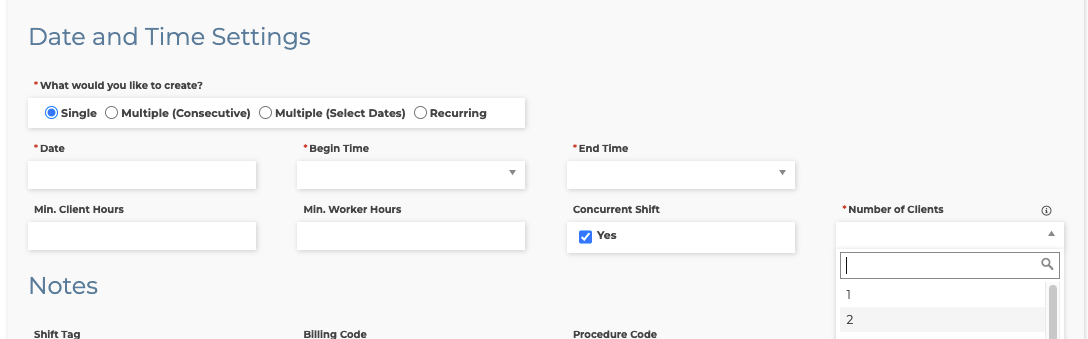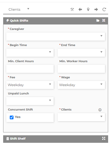 For quick shifts, in the clients view, fill out the shift info and then check the Concurrent Shift box as "Yes" and select the total number of clients being cared for at the same time under the "Clients" dropdown box. Drag the shift to the appropriate day of the week for each client that will be cared for at the same time with the same caregiver. Then, repeat the process, selecting the same number of clients (the total number) for each client that will be cared for at the same time with the same caregiver.
