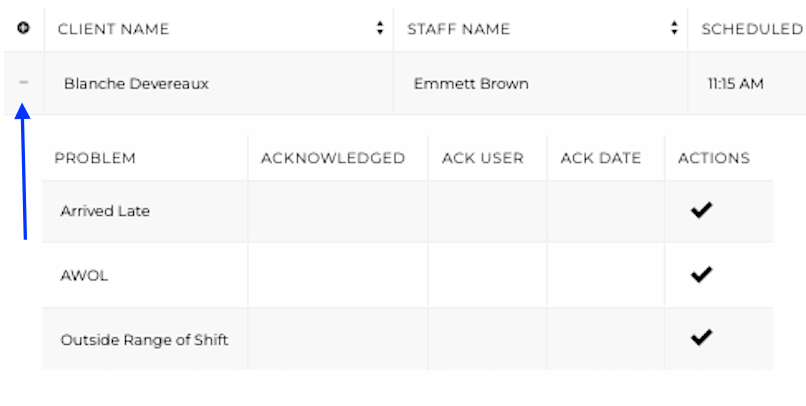 Acknowledging a Problem - After addressing a problem with the caregiver shown under the actions you can select the check mark. This will remove the problem from the actions section unless searching acknowledged problems in the search options. As well as see who and when the problem was acknowledged.